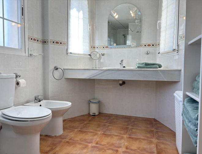 From the living area, large sliding doors open onto a covered terrace, ideal for relaxing while soaking in the incredible views. The outdoor space is a true highlight of the home, with a private swimming pool, a chill-out area, and a lush mature garden that offers both beauty and privacy. On the ground floor, there is also a guest toilet for added convenience.