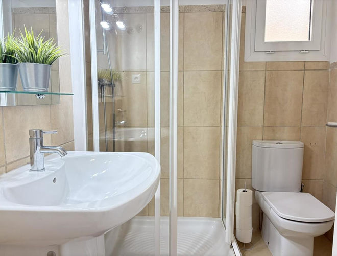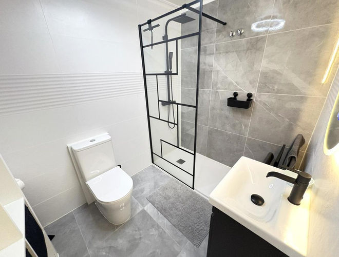 In the entrance hall, you’ll find a large built-in wardrobe. The hallway leads to a guest bathroom and the bedroom area. The apartment offers two bedrooms: one double bedroom and a master bedroom with an en-suite bathroom which has been recently renovated to a modern standard.