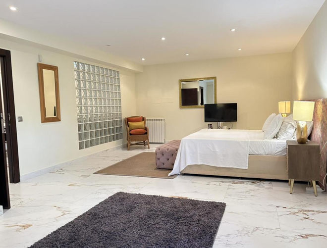 Set within a beautifully landscaped 1,800m² plot, the gardens feature mature pine and palm trees, manicured lawns, and Mediterranean planting that ensures year-round tranquility and privacy. The outdoor living area centers around a 12m x 5m overflow pool with integrated spa, surrounded by elegant terraces ideal for relaxation or entertaining. Exterior changing facilities with shower and toilet add convenience to this resort-style setting.